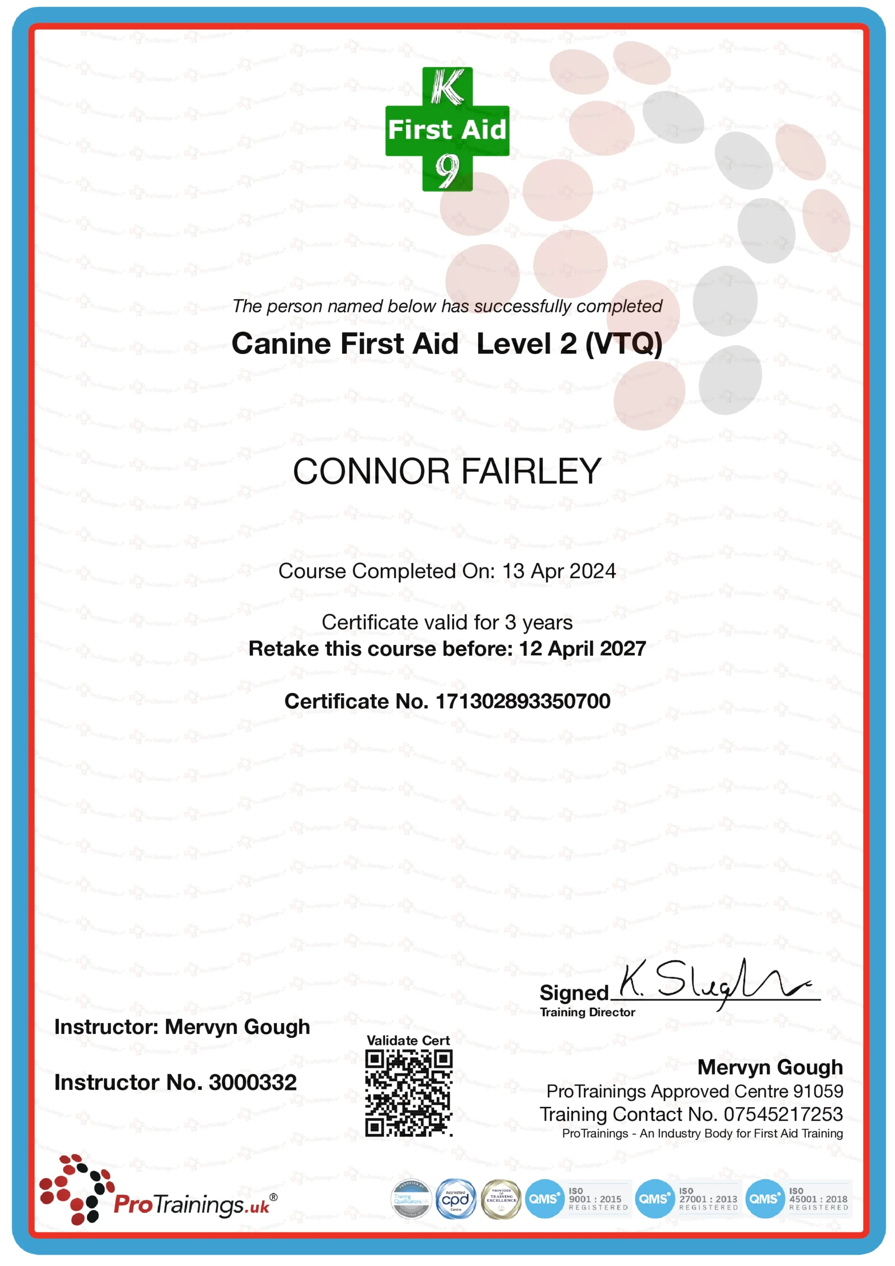 - I am qualified in K9 first aid, qualification bellow.