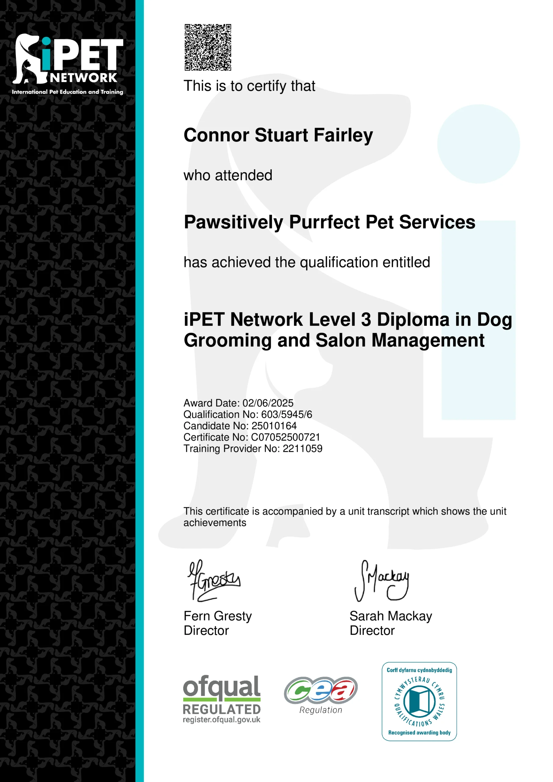 - Dog grooming - I am qualified through the Ipet network. I have a Level 3 diploma in dog grooming and salon management.